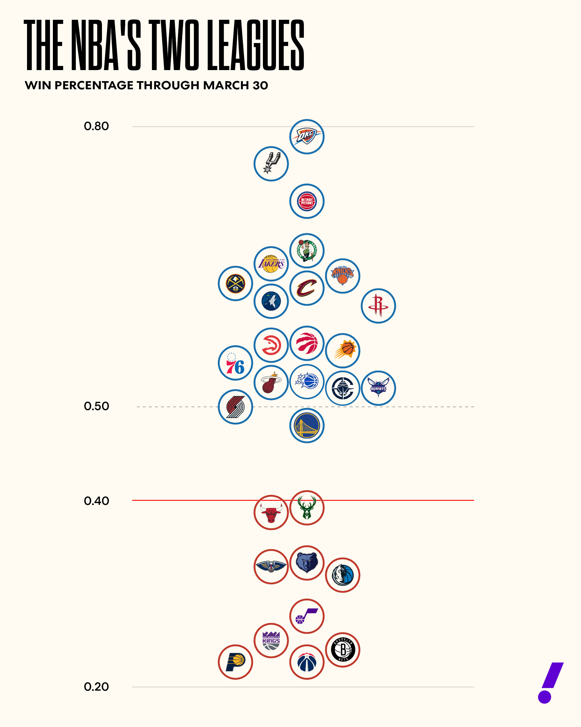 A standard read of the standings plays a trick on our brains. With the No. 11 seed shown just underneath the No. 10 seed, it’s hard to fathom how far apart those teams are. A visual representation of team standings tells the story. Then you can see an ocean between the two masses of win percentages.