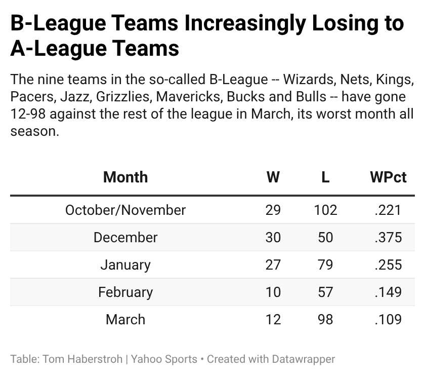 One thing to make clear: the New Orleans Pelicans, who have a 25-51 record, would be slotted in the A-League in my book because their lack of a first-round pick means they don’t have an incentive to lose. With Dejounte Murray back and interim head coach James Borrego leading the team, the Pels are a .500 team over their last 30 overall games. (Meanwhile, the Mavericks, who own their 2026 first-rounder, are 5-25.)