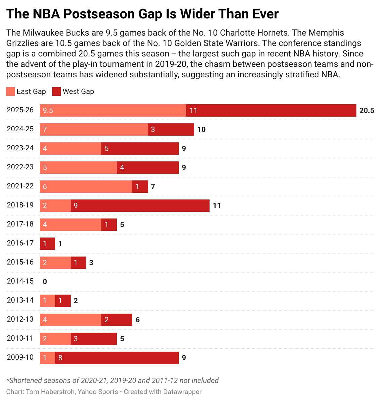 Another way to put this in perspective is looking at the postseason gap history. The East postseason gap is 9.5 games while the West postseason gap is 11 games, which means the moat between postseason teams and non-postseason teams is a combined 20.5 games. That’s nearly twice as big as the previous largest gap this century (11 games in 2018-19). In fact, this year marks by far the largest cushion since the NBA went to the 16-team playoff format in 1984.